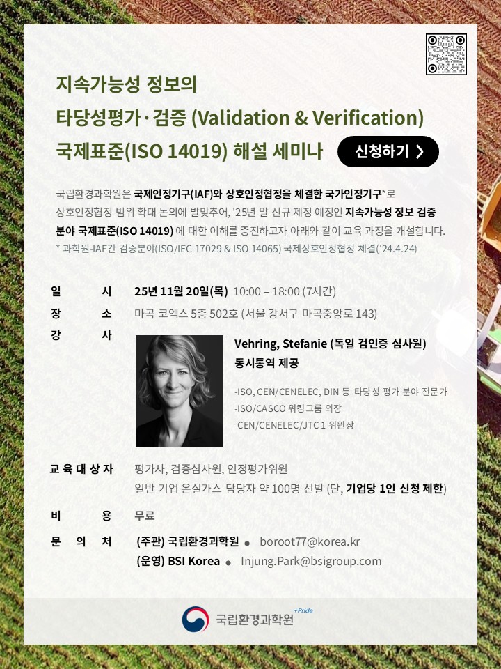 주관기관인 국립환경과학원은 국제인정기구(IAF)와 상호인정협정을 체결한 국가인정기구*로 상호인정협정 범위 확대 논의에 발맞추어, ’25년 말 신규 제정 예정인 지속가능성 정보 검증 분야 국제표준(ISO 14019) 에 대한 이해를 증진하고자 하기의 세미나를 개설하였습니다. 다가오는 25년 11월 20일(목) 개최되오니, 본 세미나에 많은 관심과 참여 부탁드리며 자세한 프로그램은 아래 포스터를 참고해주시기 바랍니다.